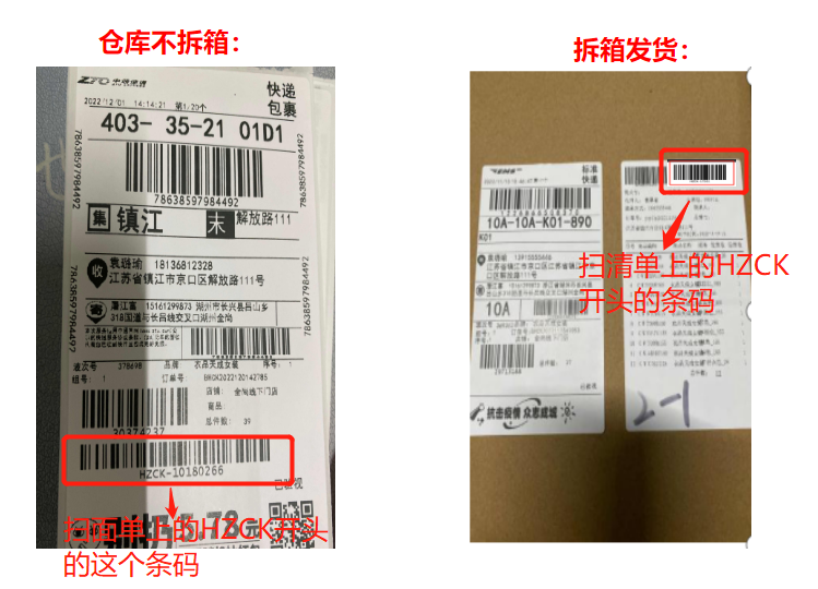 不拆箱场景下仓库不贴发货清单,只有快递面单;(左一)