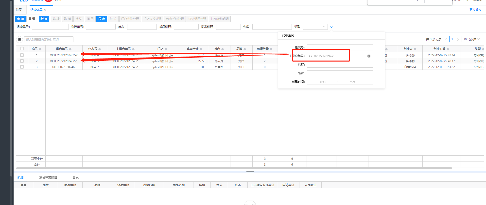 3、查询主单拆箱明细: