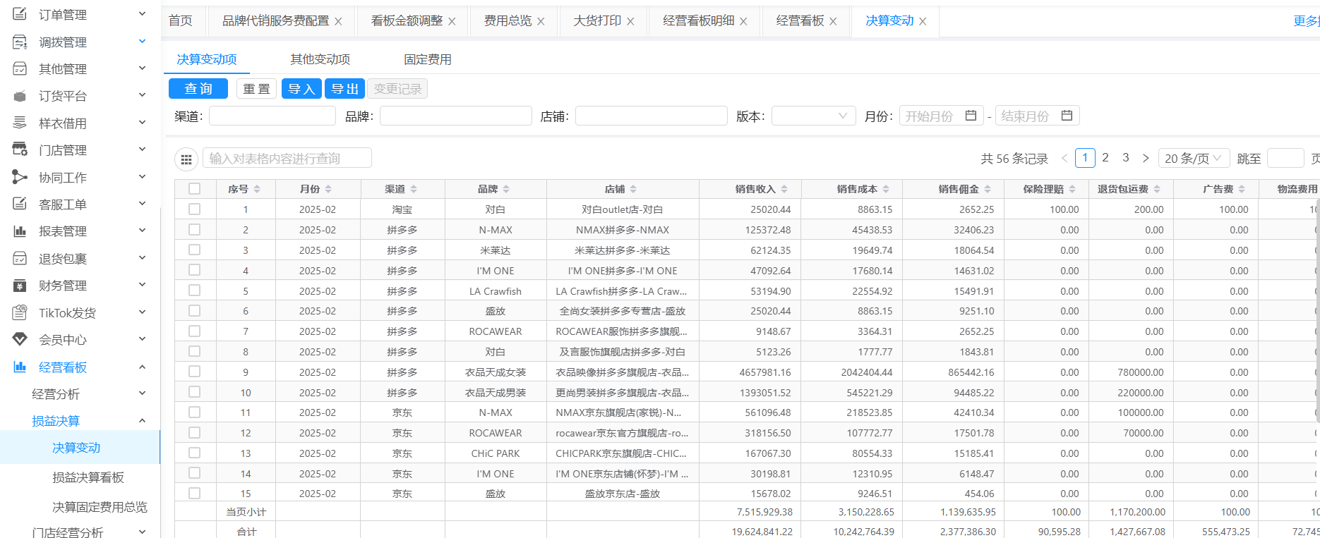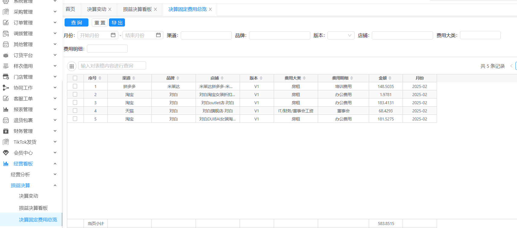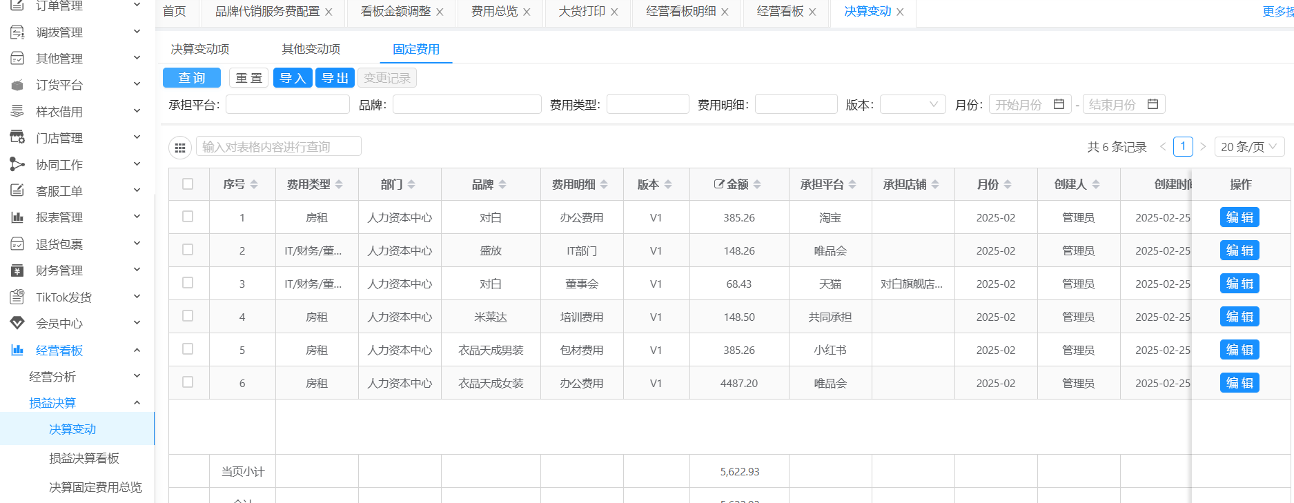 决算固定费用总览:根据财务维护的到品牌维度的固定费用决算变动信息,最终输出到店铺维度的固定费用总览,方便查看分摊后的费用信息。