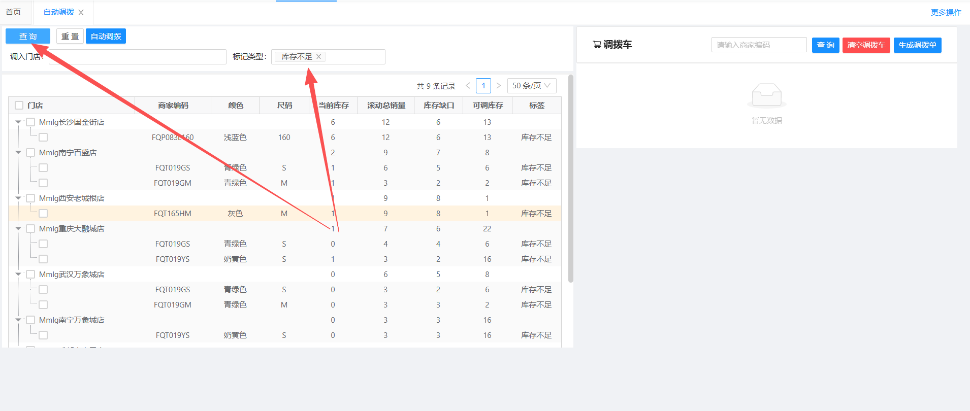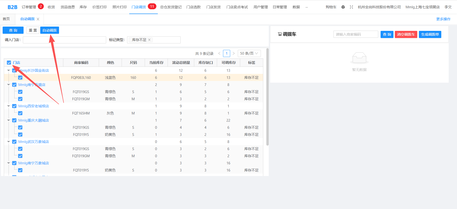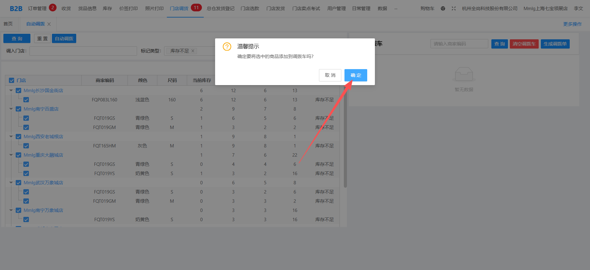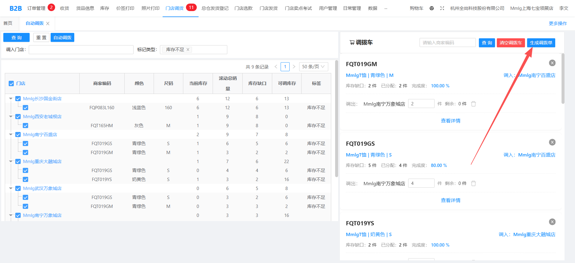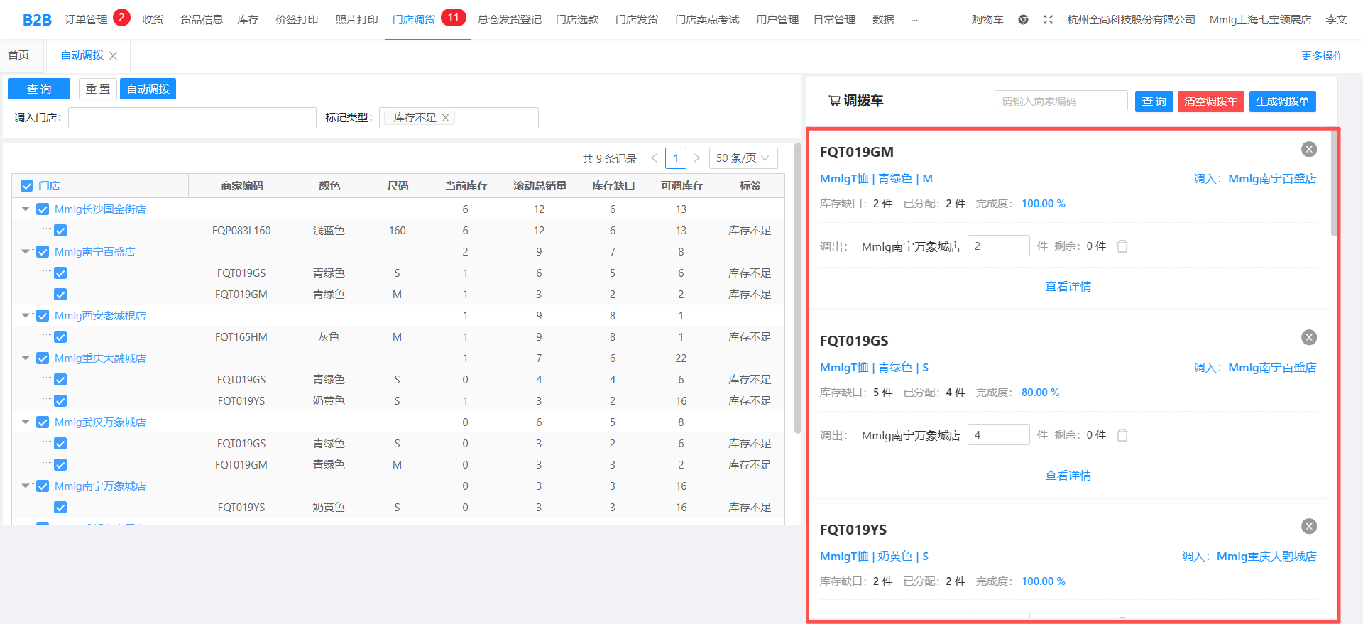 系统根据门店距离远近,自动分配可调库存,并将调拨策略加入调拨车。