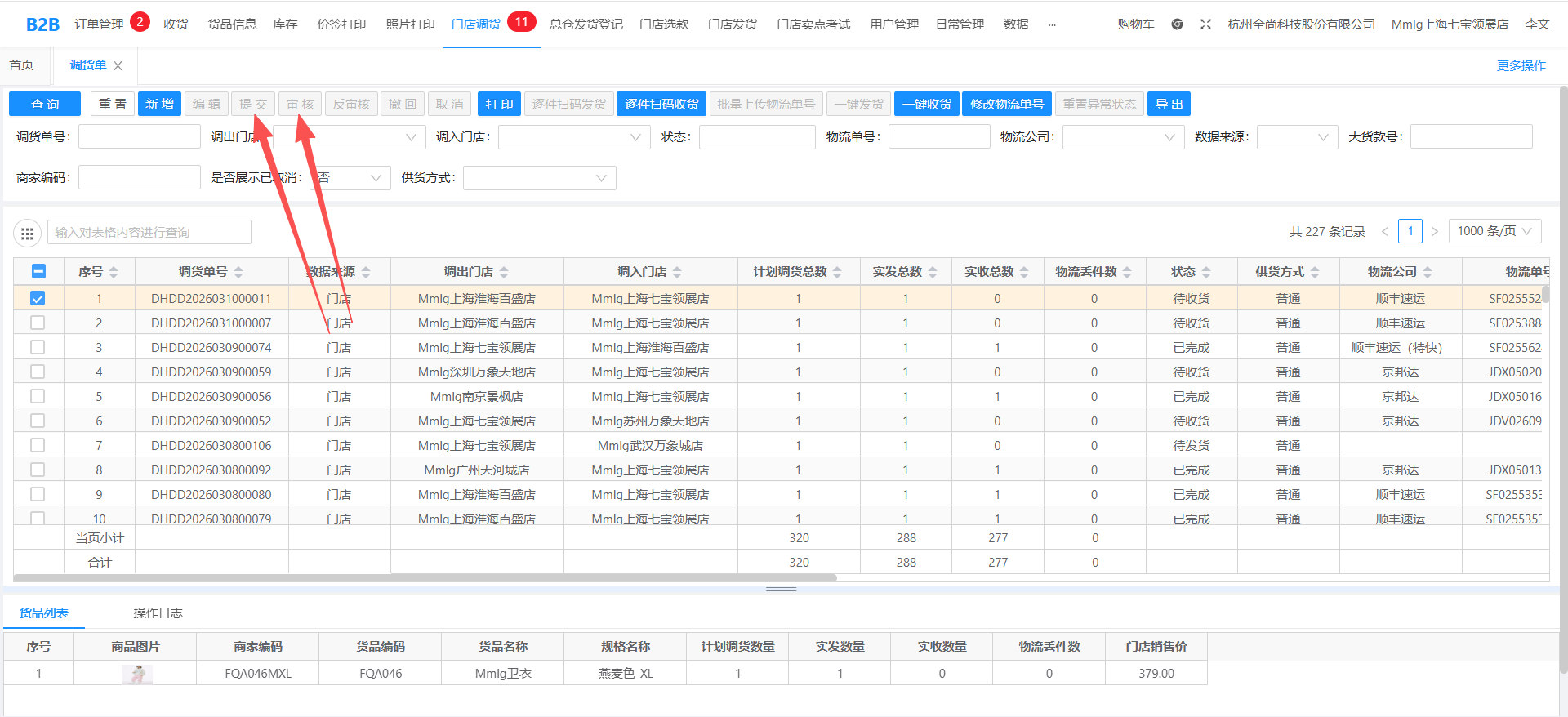 4、进入调拨单页面,将自动创建的调拨单,提交并审核。