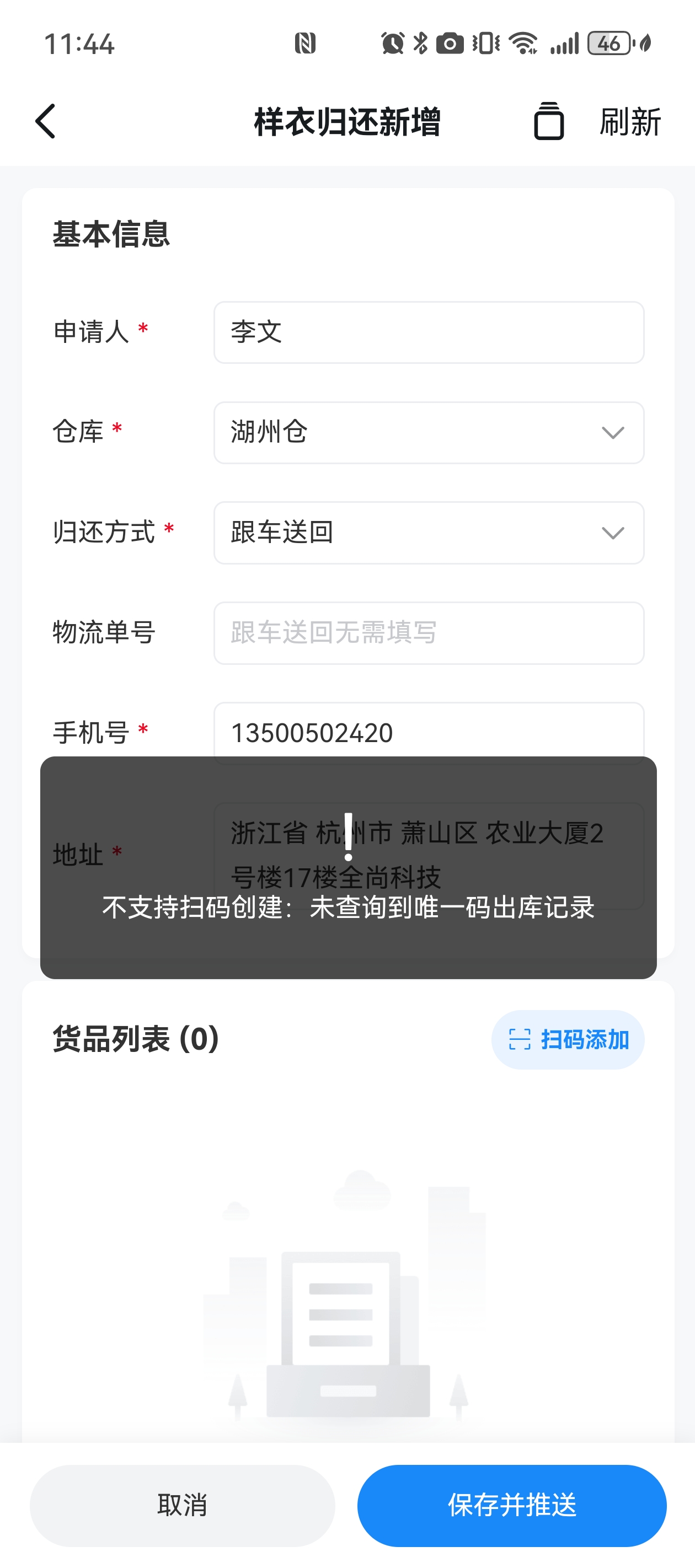 2、若扫码后提示“不支持扫码创建:未查询到唯一码出库记录”。则表示该样衣,在仓库出库时,未扫描唯一码出库,此时不支持移动端的扫码归还。需在web端的样衣归还页面,按照现有的方式操作归还。