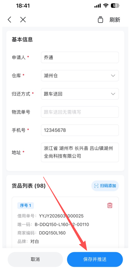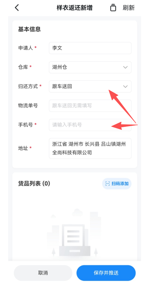 若归还方式选择了“跟车送回”,则不用填写物流单号;