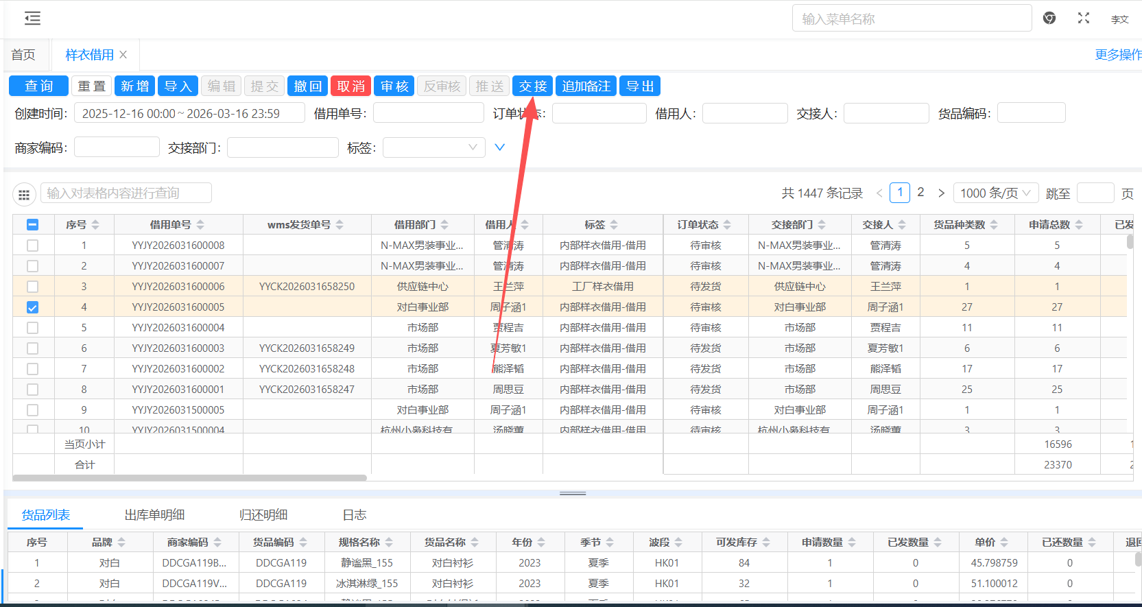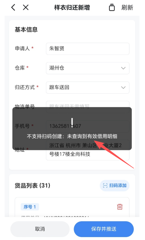 1、若扫码后提示“不支持扫码创建:未查询到有效借用明细”。则表示该样衣不在当前申请人的待归还清单中,请先在WEB端的“样衣借用”页面完成交接操作再进行扫码归还。