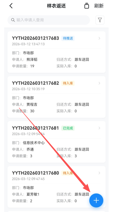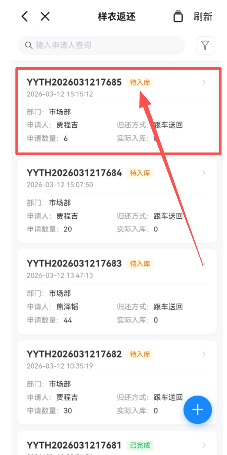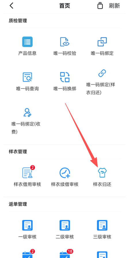 1、打开FMS钉钉小程序,进入“样衣归还”模块