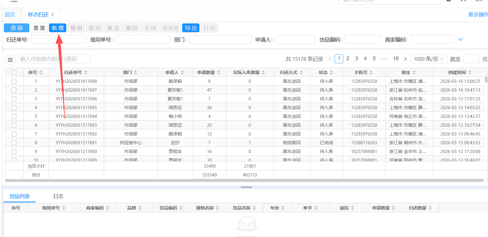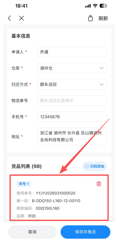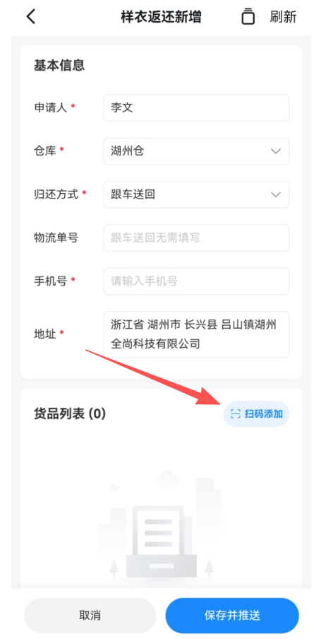 4、扫描样衣的唯一码,将待归还样衣添加到货品列表