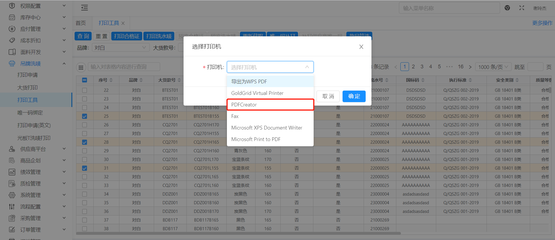 3.1 软件安装配置完成后进入打印工具页面,选择多个款号,点击打印弹出弹窗,选择 PDFCreator 即可按照选择款号生成多个pdf至指定保存路径