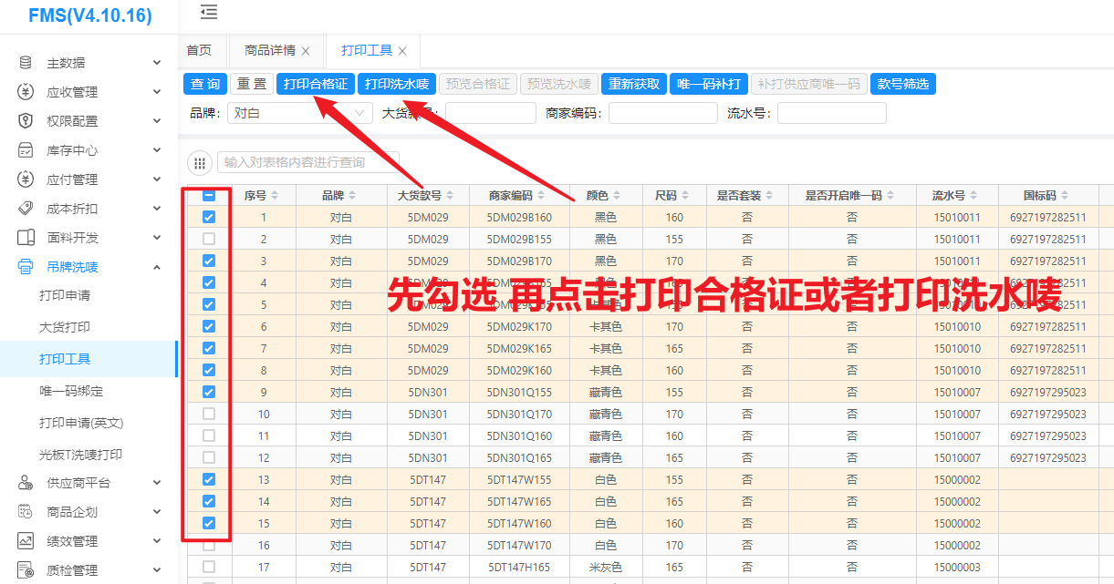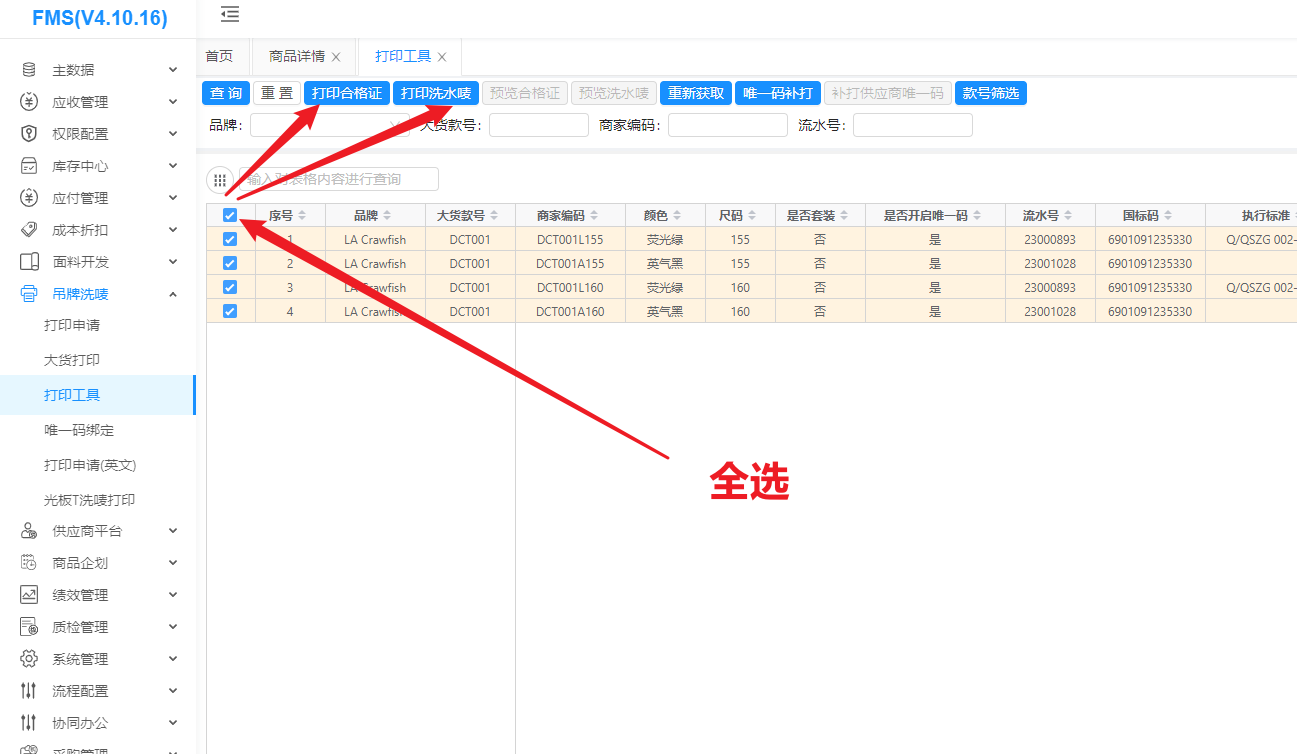 点击全选,再点击合格证或洗水唛打印即可