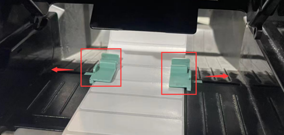5. 将标签纸卷组合装回后将出纸一侧穿过标签调整杆下方,根据标签纸宽度大小收紧标签调整杆以固定标签两侧(同样注意不可收过紧,会导致打印无法转动),调整完毕后将打印机心重新向下按压复原并盖上翻盖