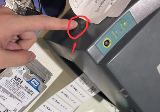 左手按住FEED键不放,右手开启打印机电源开关。
