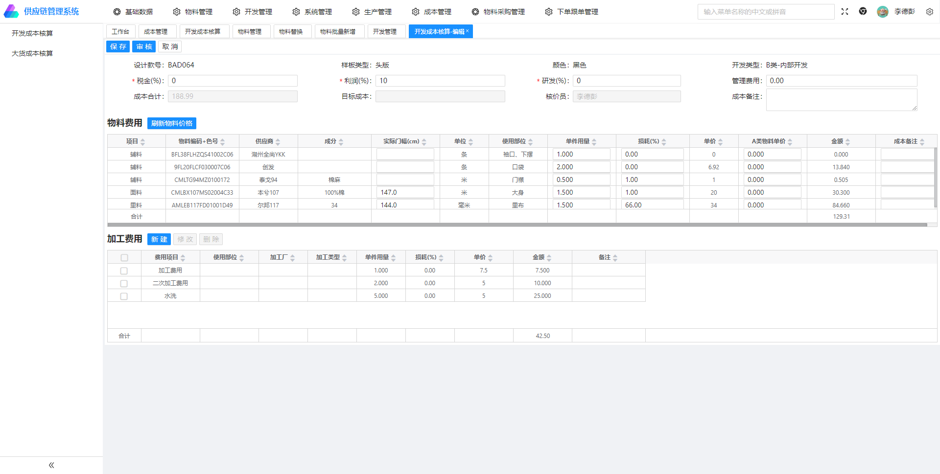 审核: 所有需要核价的内容填写完成后,在点击审核,一单审核之后需要修改信息时需要反审