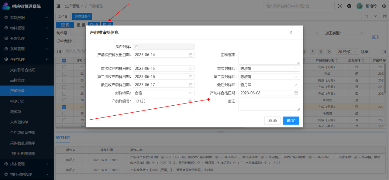 产前准备1.说明用于管理产前样是否合格以及产前样合格日期; 2.位置生产管理-产前准备 3.编辑产前样信息目前是否封样=否的不需要进行产前样审批;返单没有换工厂的不需要进行产前样审批;文档更新时间: 2024-02-26 15:36 作者:杨怡玲
