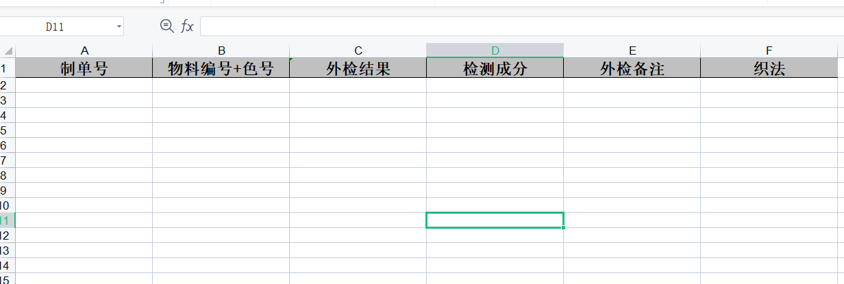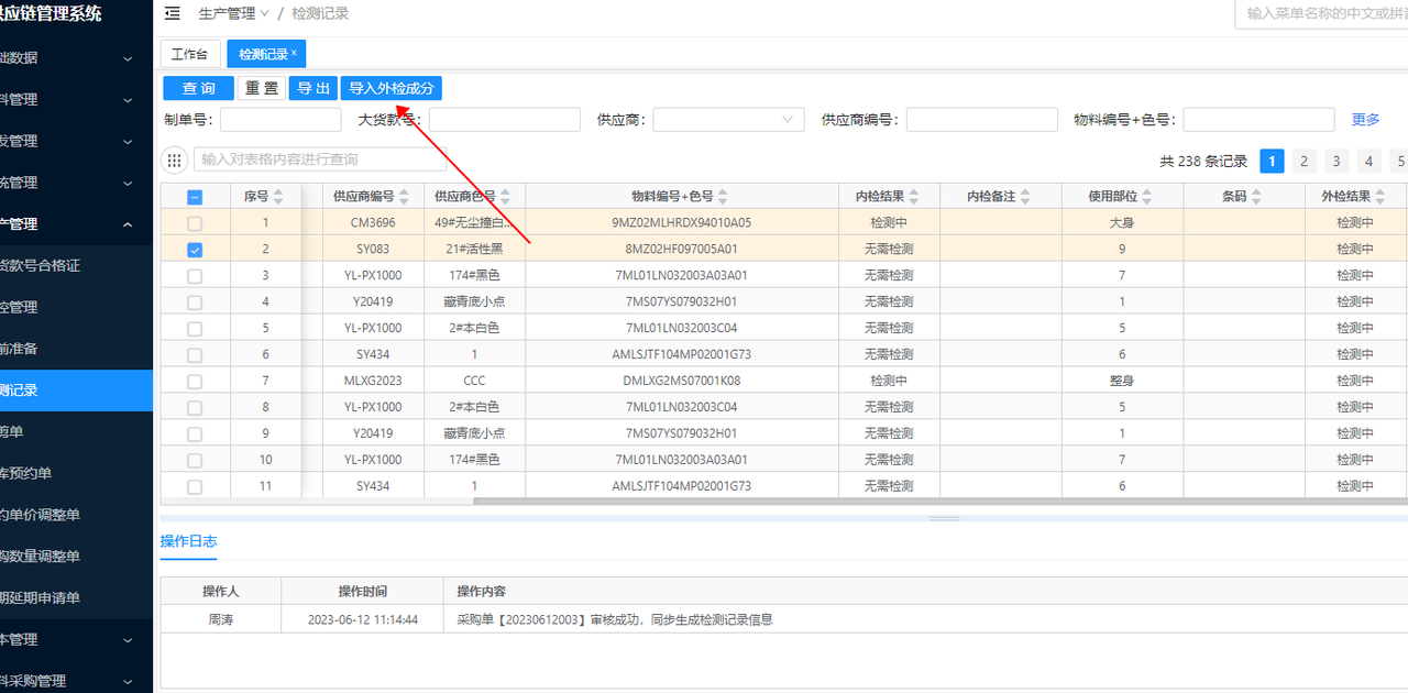 检测记录1.说明用于导入外检机构提供的外检数据,包括外检结果,检测成分,备注和织法; 2.操作(1)可按照是否需要外检=是,外检状态=检测中,检测机构,送检时间的条件先导出送检物料;(2)按照以下模板导入外检数据即可;文档更新时间: 2024-02-26 15:36 作者:杨怡玲