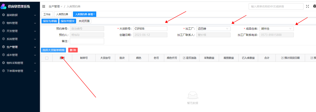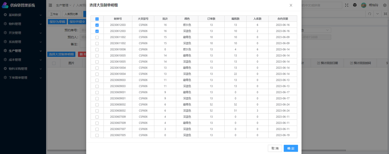 (3)需要勾选同一制单号的明细;需要有裁剪单后才可进行新建预约入库单