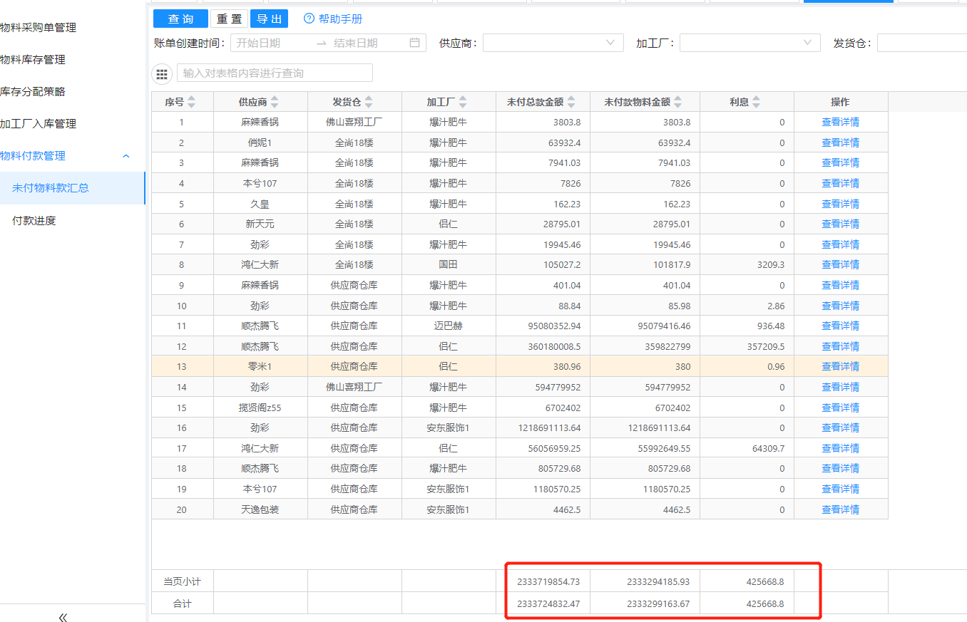 功能概述:入口:物料采购管理 –> 物料付款管理 –> 未付面料款汇总 操作详情查看 场景 主要用户汇总统计所有加工厂的欠款情况 加工厂+发货仓+供应商唯一,系统会汇总筛选时间范围内统计出来的数据 查看详情:点击进入后会自动条到单据明细里 操作界面文档更新时间: 2024-02-26 15:36 作者:李德彭