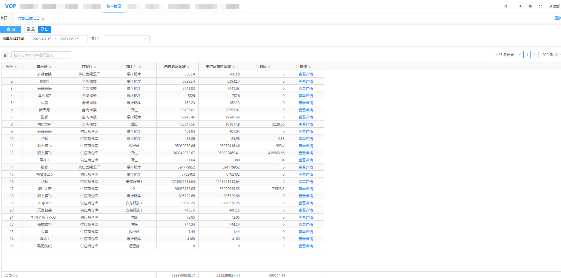 目录 搜索 更新日志常见问题改尺码改颜色删除设计下单指令删除设计款号建档基础数据品牌档案波段档案款式类型档案供应商档案颜色档案尺码号型仓库档案年份档案季节档案物料管理办料采购单办料入库单物料基础档案物料价格变更批量新增物料批量删除物料批量替换物料批量替换管理费用规则说明企划企划波段企划款式类型外部开发企划款式企划类型修改设计开发设计款号建档开发评审记录表设计下单指令开发BOM管理工艺单大货BOM管理AB类开发样管理使用说明-重要B类开发样板房操作A类理单登记开发样借用开发样报废板房或者仓库收货样衣库存管理样衣进度管理样衣制作指令样衣制作管理裁剪缝制进度样衣制作指令(印花)生产管理大货款号合格证品控管理检测记录产前准备裁剪单入库预约单合约单价调整单采购数量调整单货期延期调整单成本管理开发成本核价大货成本核价物料采购管理物料库存管理库存分配策略物料采购单供应商发货单加工厂入库单物料付款管理未付面料款汇总付款进度备货采购操作流程下单跟单管理印花下单管理大货款号管理运营返单生产下单管理成衣采购管理理单跟单预下单管理预下单核价单调整拍照样管理报表管理报表开发SQL模板VOP系统登录说明物料管理(供应商)物料基础档案供应商发货单物料付款管理付款进度汇总付款进度列表生产管理理单跟单裁剪单入库预约单物料管理(加工厂)供应商发货单(加工厂)付款进度汇总付款进度列表代销管理代销出入库概述预约入库手机钉钉端采购单-预约单查询各个系统地址 暂无相关搜索结果! 本文档使用 MinDoc 发布 付款进度汇总 功能概述:汇总统计了 加工厂未付面辅料款的汇总金额,支持查看明细 入口: 物料管理 --> 付款进度汇总操作详情查询 操作界面:文档更新时间: 2024-02-26 15:36 作者:李德彭