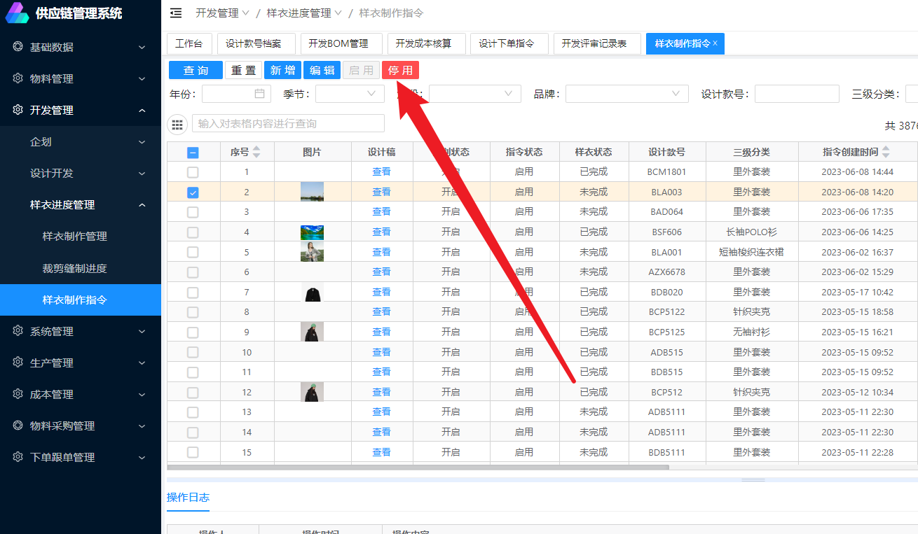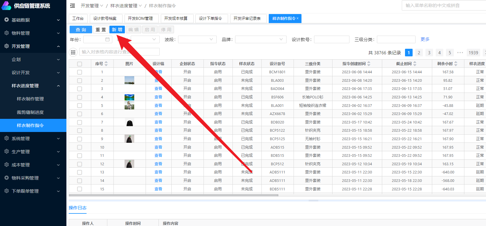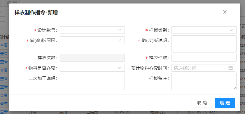 功能概述: B类创建样衣指令,创建后版师部门即可接到做样衣的指令入口: 可以在菜单中选择:开发管理》样衣进度管理》样衣制作指令 也可在设计款号建档页面点击打版图标跳转到 样衣制作指令页面操作明细1.点击新增按钮即可弹出打版指令弹窗 输入设计款号,样板类别、做版原因,做版说明,样衣件数,物料是否齐套等信息,点击确定即可完成打版指令的创建 如果创建打版指令后,创建错了,或者工作进行中发现无需打版时,需找李师傅进行删除文档更新时间: 2024-02-26 15:36 作者:王安东