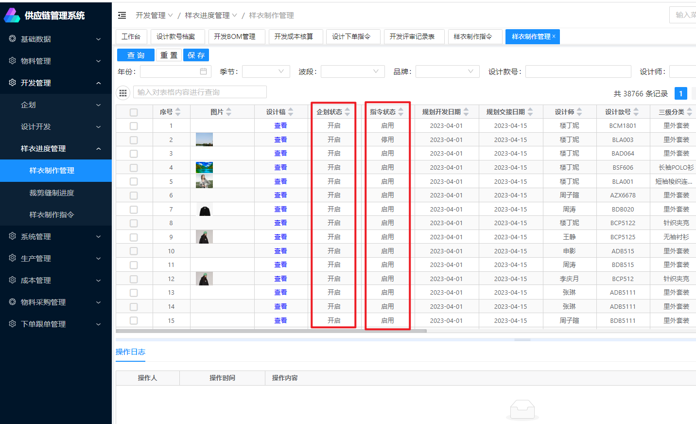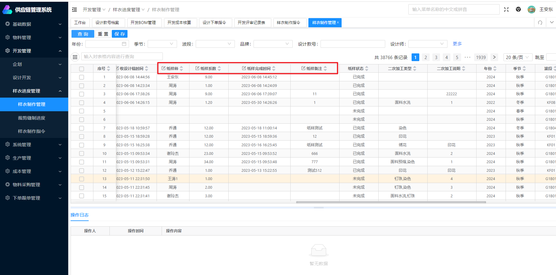 功能概述: 样衣制作指令创建后,本页面对打版信息进行记录入口: 可以在菜单中选择:开发管理》样衣进度管理》样衣制作管理操作明细进入页面必须先点击查询按钮,点击查询按钮可以查询到所有信息在每一条信息中都可编辑纸样师、纸样系数、纸样完成时间、纸样备注等信息,修改信息后一定要点击保存按钮,保存成功后即可完成 纸样完成时间登记后,纸样状态从未完成改成已完成 注:如果企划状态 或者 指令状态未启用,那么本条信息无法登记文档更新时间: 2024-02-26 15:36 作者:王安东