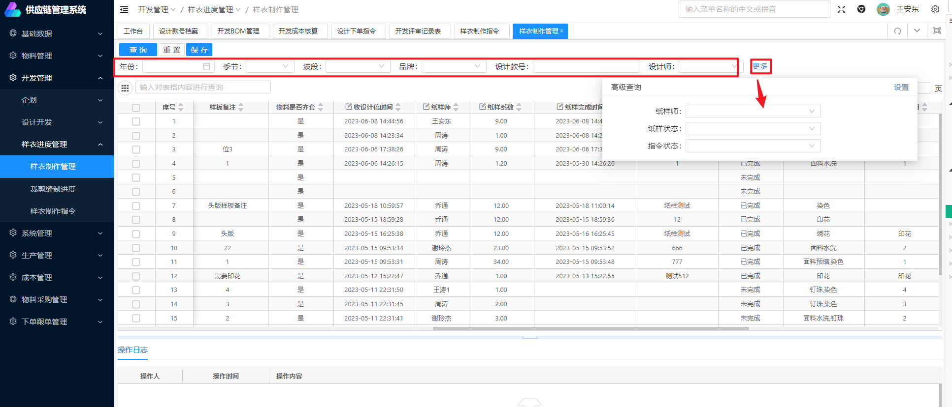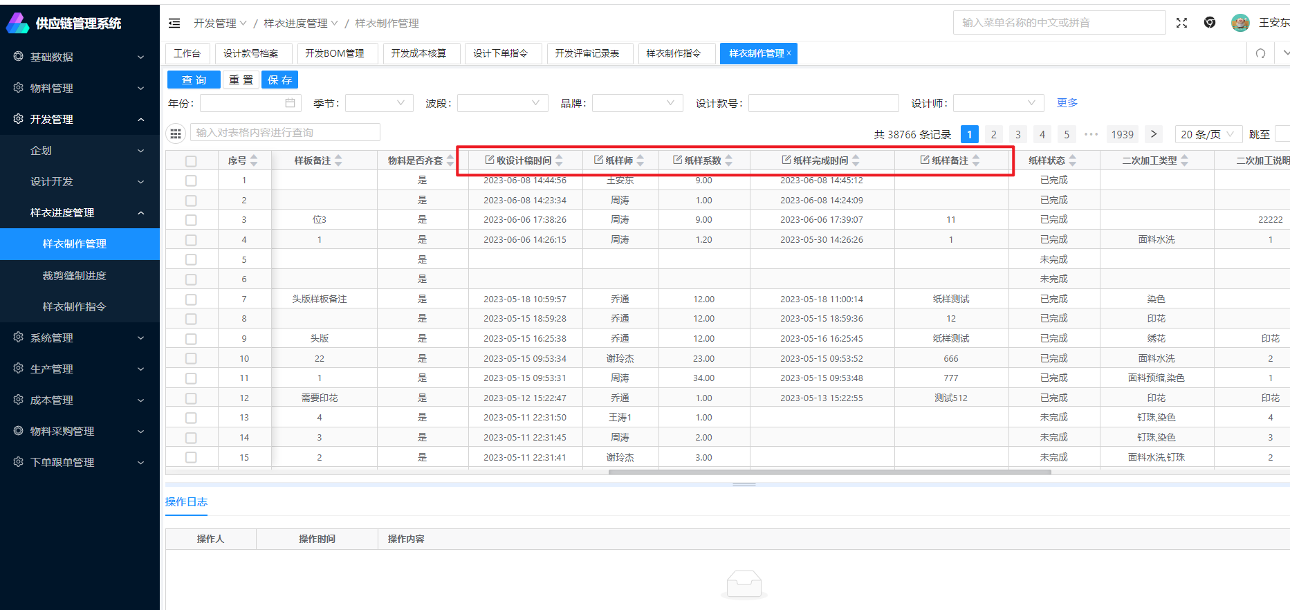 功能概述: 打版完成后,在本页面进行裁剪缝制进度等信息的登记入口: 可以在菜单中选择:开发管理》样衣进度管理》裁剪缝制进度操作明细 1.可在本页面登记收设计稿时间、纸样师、纸样系数、纸样完成时间、纸样备注、纸样状态等信息;登记成功后点击保存按钮即可保存,如果没有点击保存,登记无效顶部可以根据自己的需要进行筛选 底部可查看操作日志文档更新时间: 2024-02-26 15:36 作者:王安东