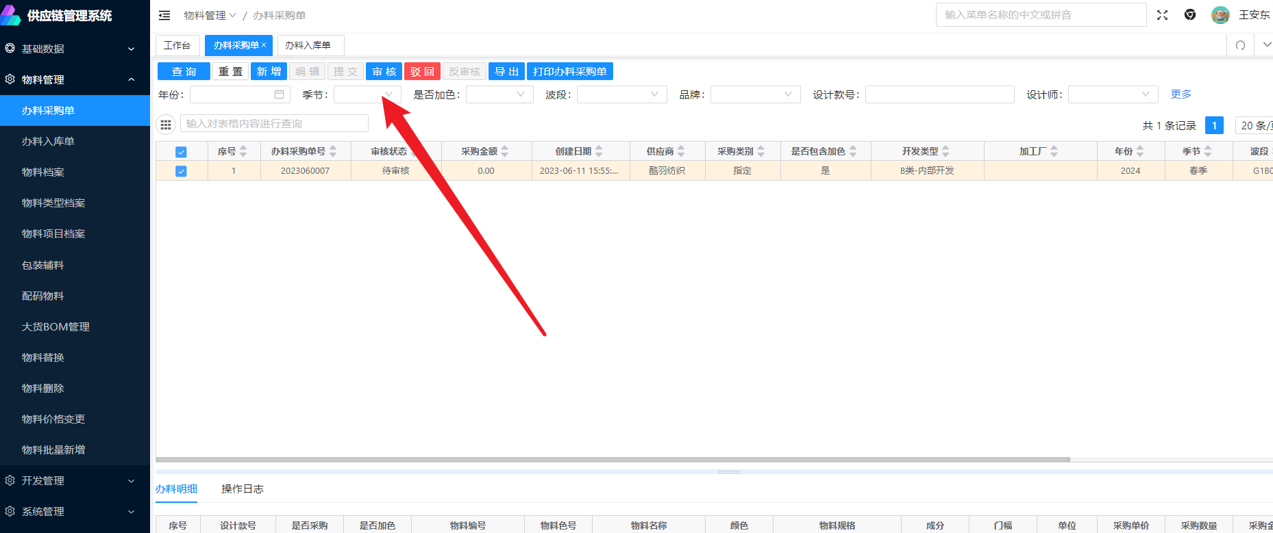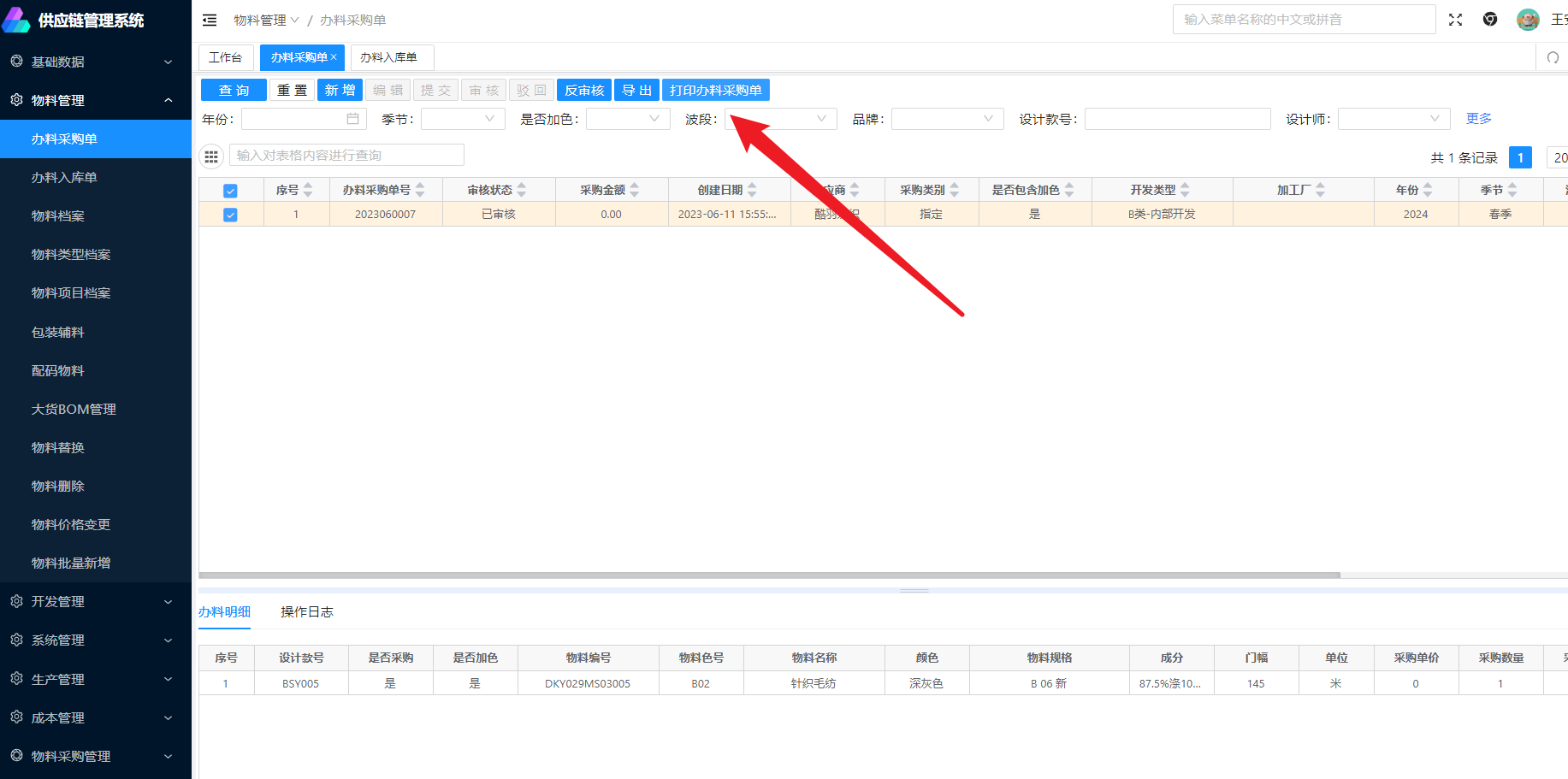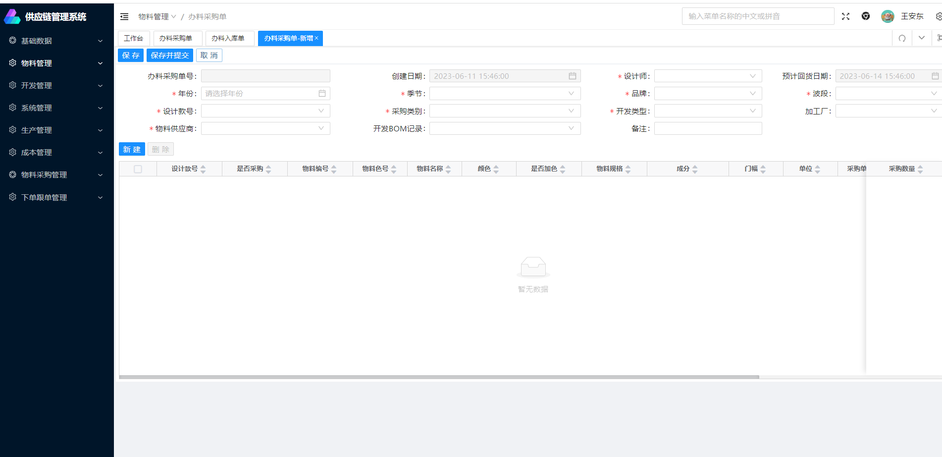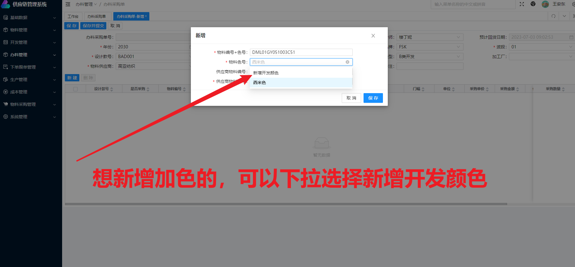 在新增页面输入设计师,年份,季节、品牌、波段、供应商等信息后,在点击新建,可以新建该供应商下的办料采购单