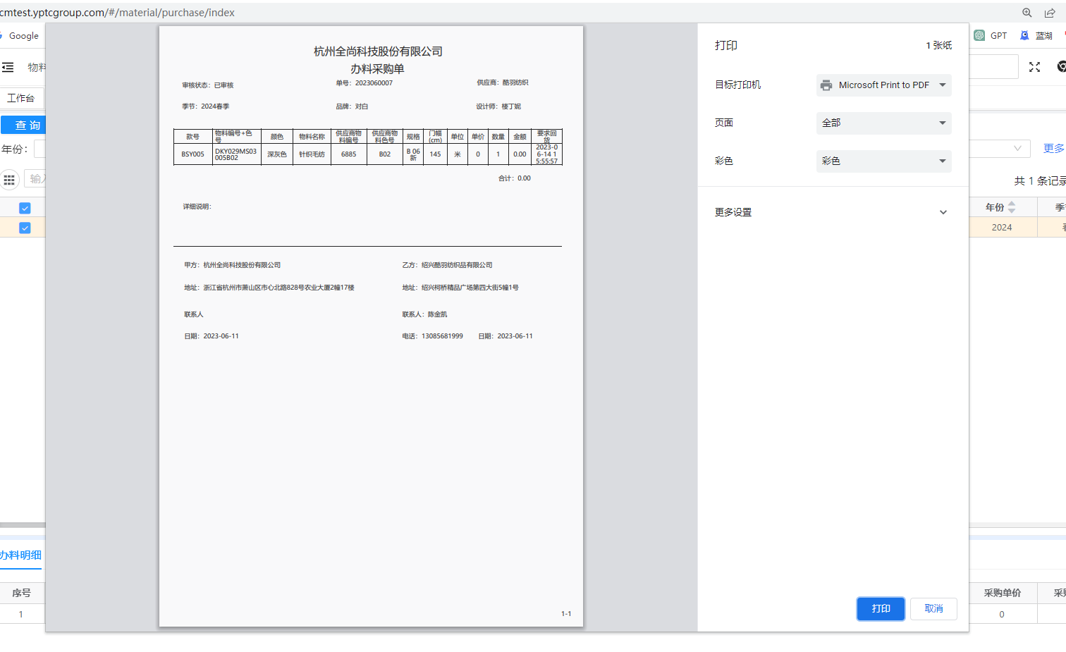 选中物料点击打印办料采购单,可为办料采购单信息进行打印