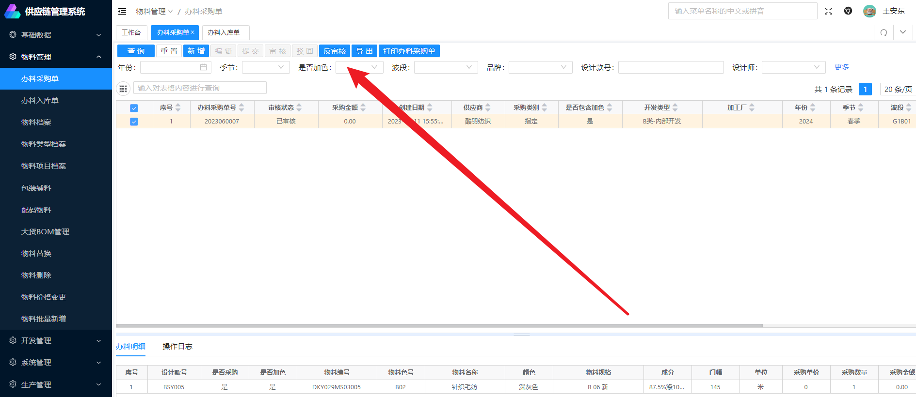 选中办料采购单,点击审核按钮,办料采购单状态即可变为已审核状态,此时可通知相应的面料供应商进行物料采购送货等业务