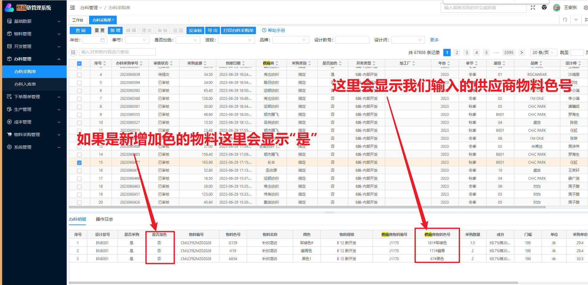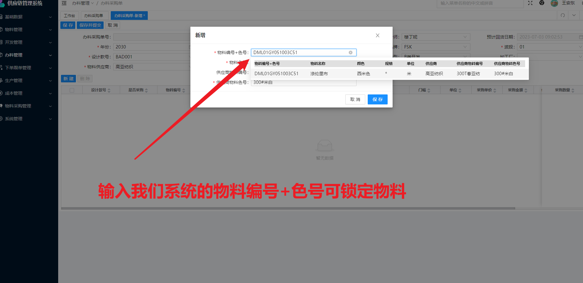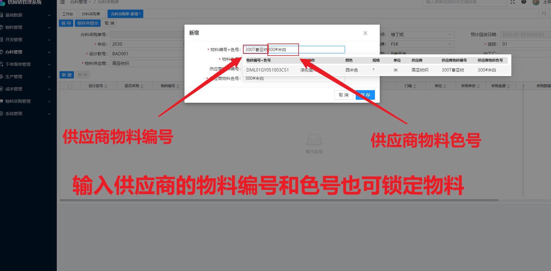 输入我们系统的物料编号+色号可锁定物料;输入供应商的物料编号和色号也可锁定物料