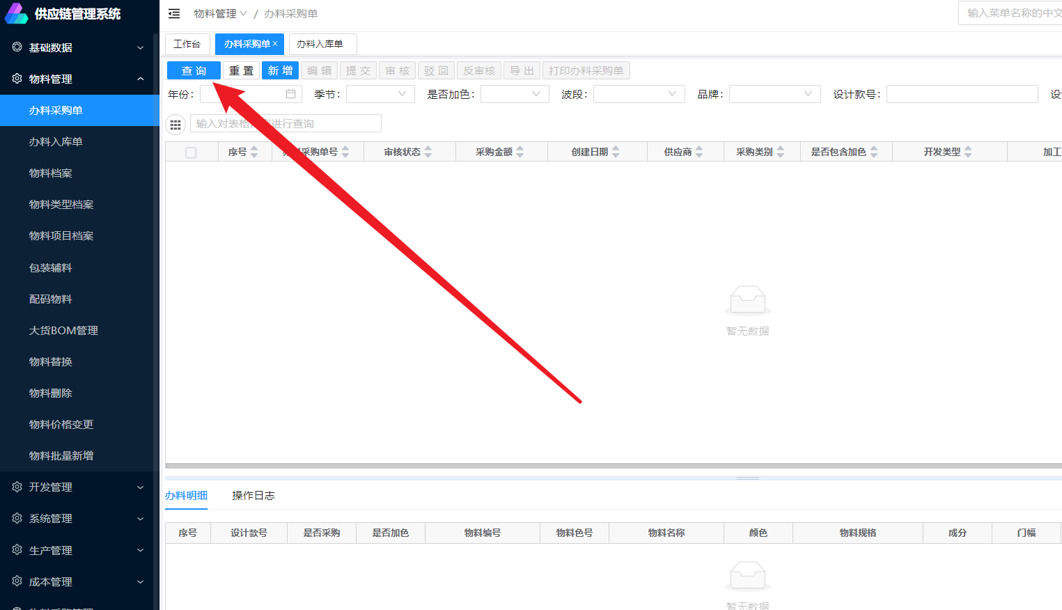 点击查询可查询到所有的办料信息