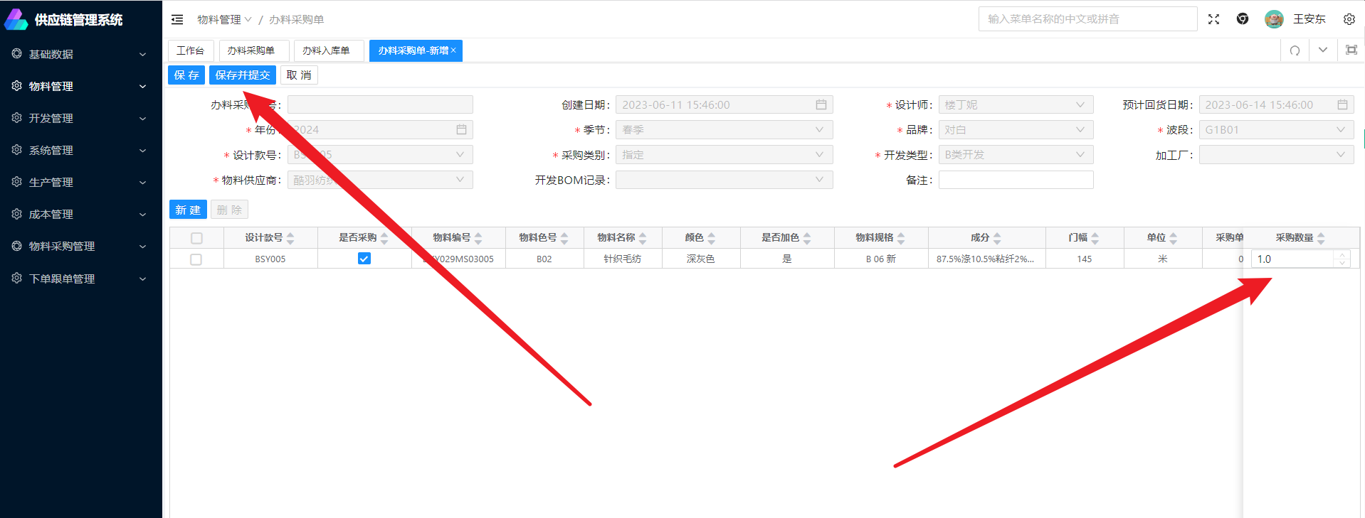 物料添加成功后,再输入办料数量,点击保存并提交即可完成办料采购单的创建