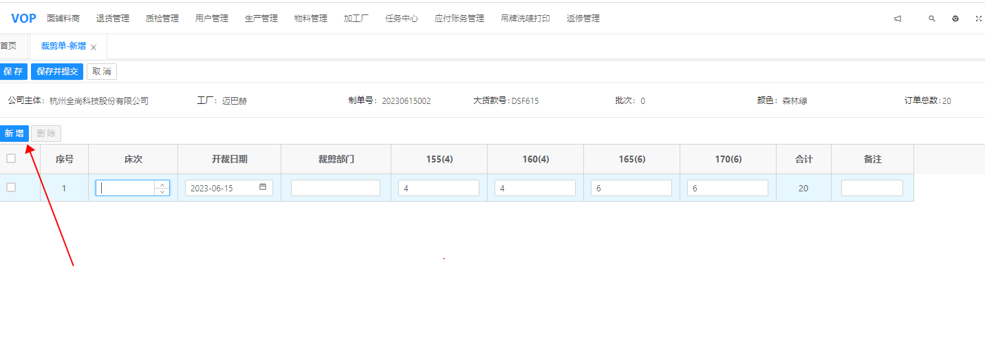 vop端-裁剪单1.说明用于加工厂提报裁剪数; 2.位置vop-生产管理-裁剪单 3.新建制单号+颜色维度会有草稿状态的裁剪单,勾选后点击新建会跳转新页点击新增会添加床次明细默认裁剪数=订单数,可进行修改,修改完成后点击提交即可;若裁剪单总数在订单总数的正负10%以内,会直接审核通过;若在正负10%以外,则需要我司的理单人员进行审核;文档更新时间: 2024-02-26 15:36 作者:杨怡玲