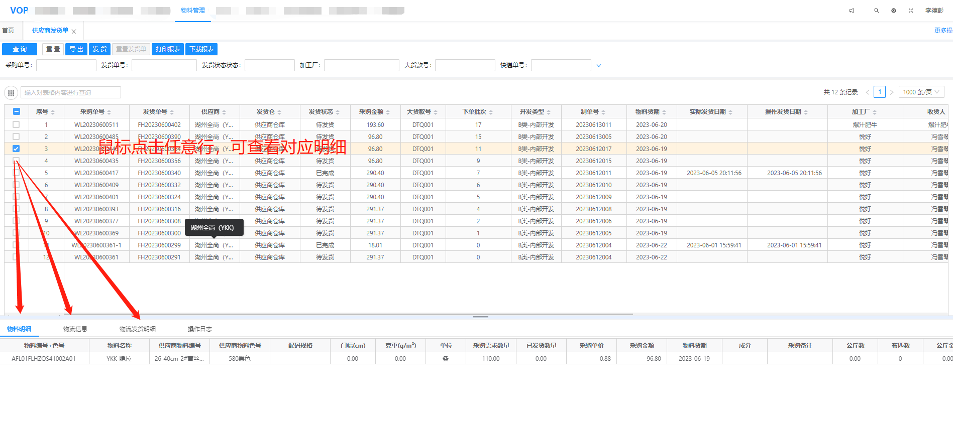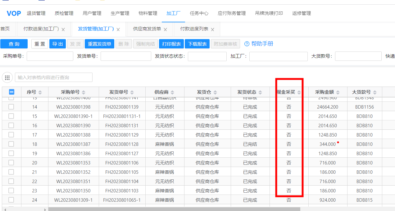 功能概述:用于查看供应商的发货情况,与老SCM功能基本一致,在原有的基础上增加支持查看供应商部分发货的功能,物料明细展示更全 入口: 加工厂 --> 供应商发货单操作详情查询 场景: 查看要发货的物料信息,可根据状态筛选哪些发货了,哪些没发货 操作界面: 查看明细 场景:查看物料的明细发货数量、物流信息等 现金采买场景:用于新工厂直接向面辅料商进行现金采买的订单标记;文档更新时间: 2024-02-26 15:36 作者:李德彭