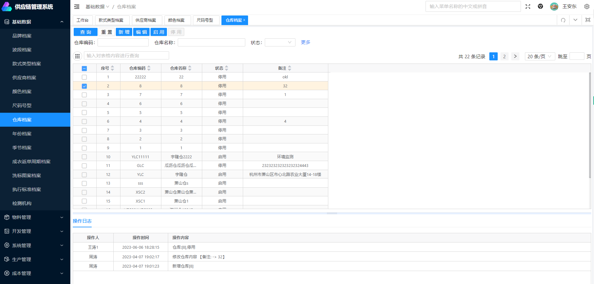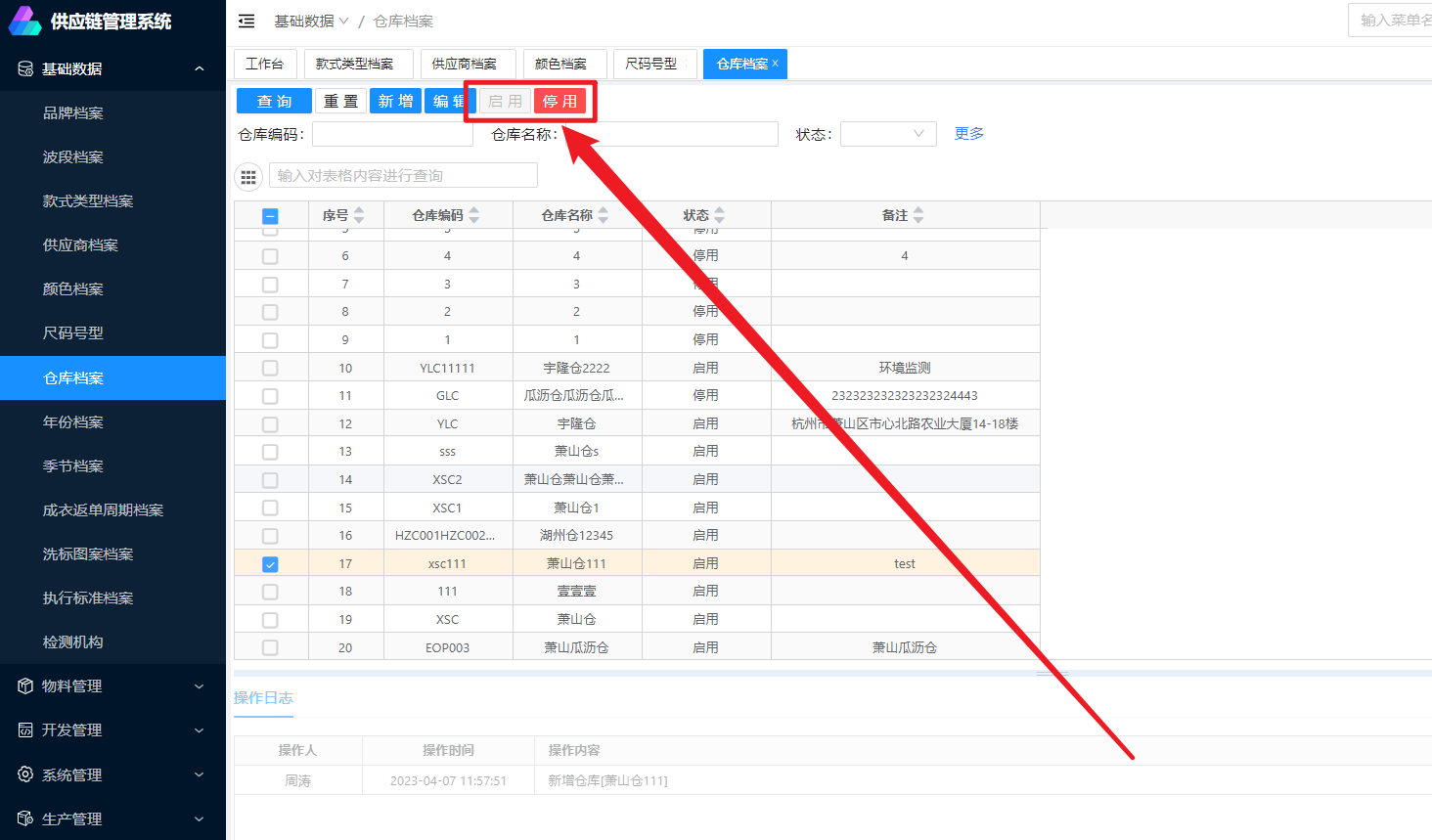 目录 搜索 更新日志常见问题改尺码改颜色删除设计下单指令删除设计款号建档基础数据品牌档案波段档案款式类型档案供应商档案颜色档案尺码号型仓库档案年份档案季节档案物料管理办料采购单办料入库单物料基础档案物料价格变更批量新增物料批量删除物料批量替换物料批量替换管理费用规则说明企划企划波段企划款式类型外部开发企划款式企划类型修改设计开发设计款号建档开发评审记录表设计下单指令开发BOM管理工艺单大货BOM管理AB类开发样管理使用说明-重要B类开发样板房操作A类理单登记开发样借用开发样报废板房或者仓库收货样衣库存管理样衣进度管理样衣制作指令样衣制作管理裁剪缝制进度样衣制作指令(印花)生产管理大货款号合格证品控管理检测记录产前准备裁剪单入库预约单合约单价调整单采购数量调整单货期延期调整单成本管理开发成本核价大货成本核价物料采购管理物料库存管理库存分配策略物料采购单供应商发货单加工厂入库单物料付款管理未付面料款汇总付款进度备货采购操作流程下单跟单管理印花下单管理大货款号管理运营返单生产下单管理成衣采购管理理单跟单预下单管理预下单核价单调整拍照样管理报表管理报表开发SQL模板VOP系统登录说明物料管理(供应商)物料基础档案供应商发货单物料付款管理付款进度汇总付款进度列表生产管理理单跟单裁剪单入库预约单物料管理(加工厂)供应商发货单(加工厂)付款进度汇总付款进度列表代销管理代销出入库概述预约入库手机钉钉端采购单-预约单查询各个系统地址 暂无相关搜索结果! 本文档使用 MinDoc 发布 仓库档案 功能概述: 添加仓库基础档案入口: 基础数据》仓库档案操作明细点击查询即可查新已经添加的仓库 点击新增按钮即可弹出新增仓库弹窗,输入仓库编码,仓库名称,点击确认即可保存成功 选中仓库,点击启用,停用后即可停用启用账号,停用后的仓库,不显示在系统中文档更新时间: 2024-02-26 15:36 作者:王安东