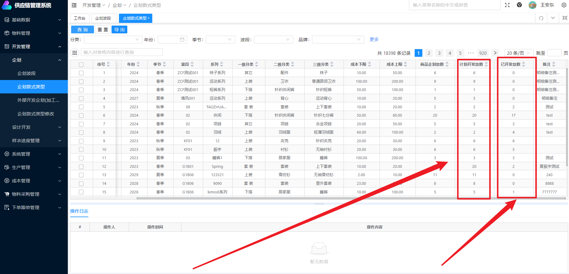 功能概述: FMS创建企划成功推送后,可在本页面进行查看具体企划款式类型信息入口: 开发管理》企划》企划波段操作明细点击查询可查询到所企划款式信息,这里可以查看企划所属的款式类型在字段中也可以看到计划开发企划信息和已开发款数,文档更新时间: 2024-02-26 15:36 作者:王安东