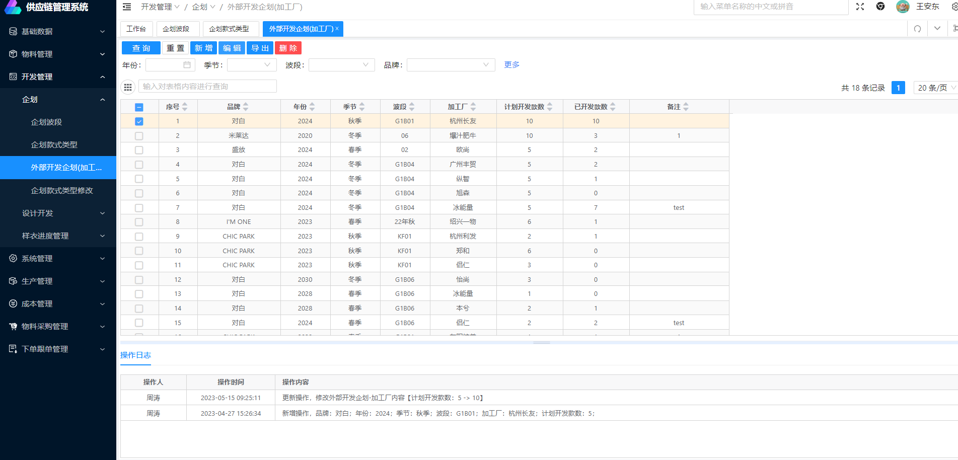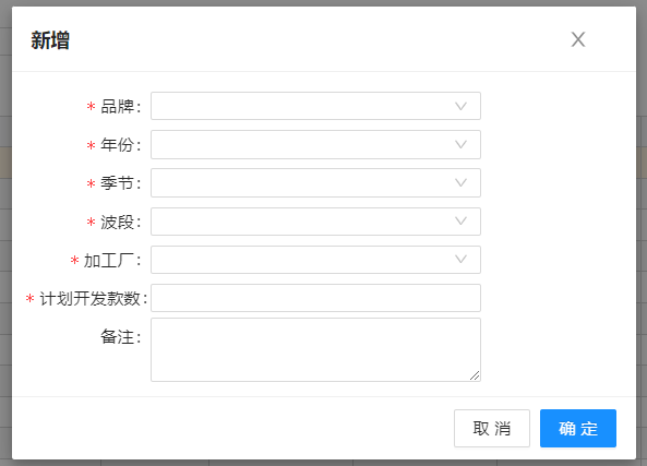 点击新增,可弹出弹窗,输入品牌 年份 季节 波段等信息可以找打到指定企划,输入计划开发款式即为该企划下外部加工厂的款数