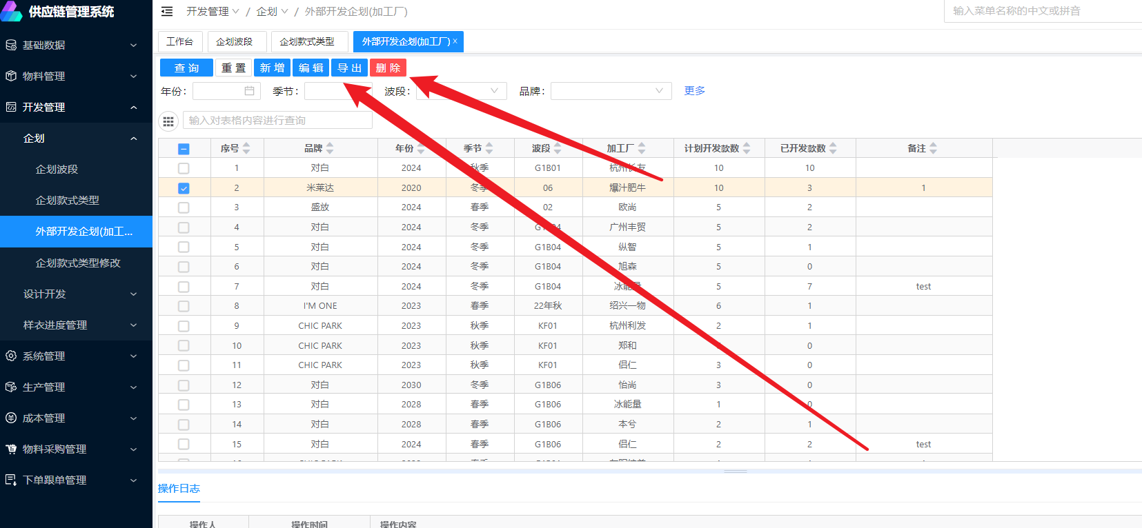 点击删除可以对已创建的外部开发企划进行删除,如果该企划已经创建A类款号,删除失败