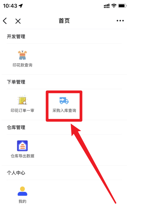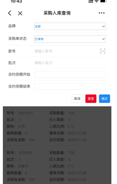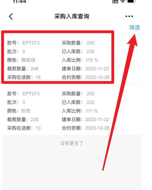 1.打开手机钉钉,点击中间的全尚科技 2.找到SCM>>采购入库查询 3.查看正在进行中的款号,可查看入库比例、裁剪数量、采购在途、合约货期等信息 也可自行进行筛选 4.点击进去后可查看个尺码入库情况,各个预约单情况等信息文档更新时间: 2024-02-26 15:36 作者:王安东