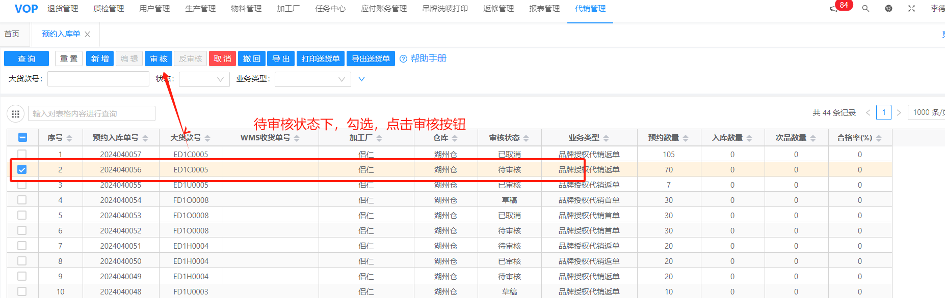 首单(款+色)预约入库时需要送样衣给仓库,仓库按样衣进行全检;
