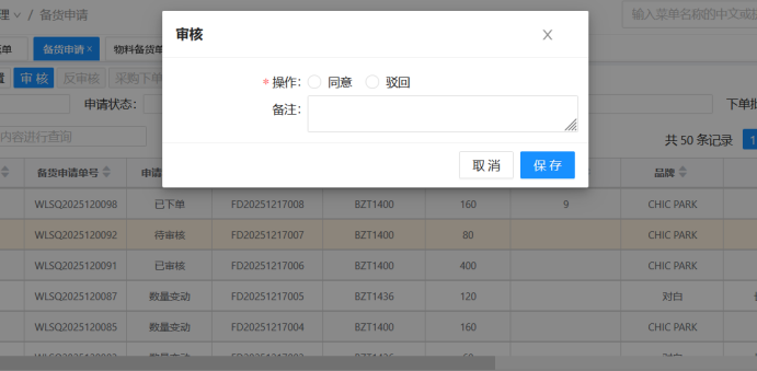 选中“待审核”的备货申请后,点击“审核”按钮。弹窗中选择审核意见,通过后,此备货申请的状态更新为“已审核”。