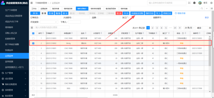 1、产品运营,在“运营返单”页面,发起备货采购。(仅返单草稿状态,允许发起)