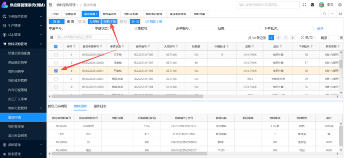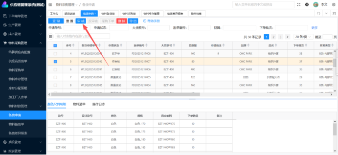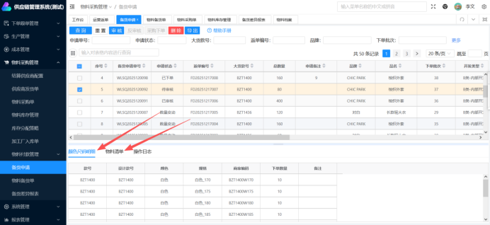 选中备货申请后,可查看该申请发起时,颜色尺码的下单数量,以及对应的物料备货需求清单。
