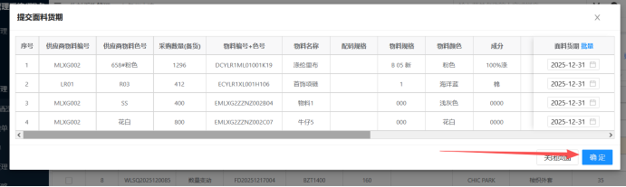 填写各供应商的面料货期后,点击确定后,即生成各供应商的备货采购单。