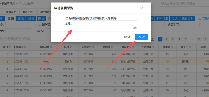 弹窗中填写申请备注,保存后,将根据此返单生成待审核的备货申请记录。