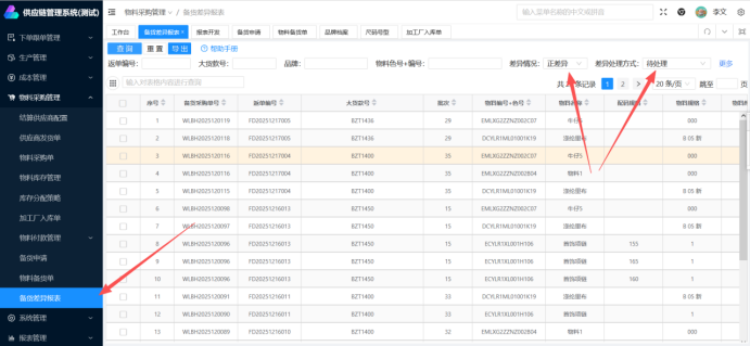 正式下单后,系统自动比较正式物料采购单和备货物料采购单的数量差异,并形成报表可供查询。系统默认会查询差异处理方式为“待处理”,且差异情况为“正差异”的备货物料的差异数据。