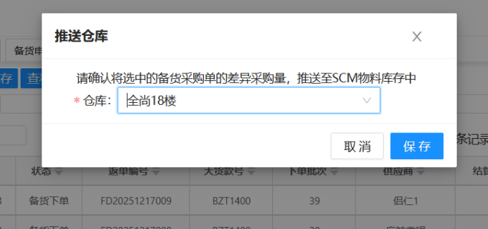 对于存在未处理的物料采购差异(正差异)的物料备货单,可选中后,点击“推送库存”按钮。弹窗中,选择仓库位置后,系统会将此物料的采购差异推送至SCM的物料库存表中。