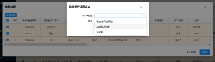 正式下单后,系统自动比较正式物料采购单和备货物料采购单的数量,计算出差异。物料理单员,选中状态为“正式下单”物料备货单后,点击“差异处理”按钮,打开弹窗进行处理。