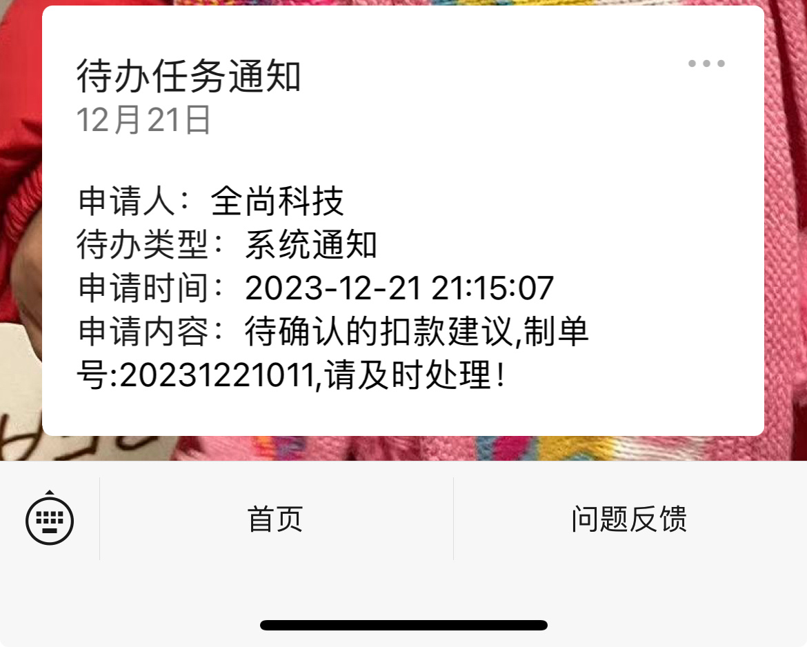 大货延期生成扣款建议的时候,会给对应的供应商发送微信消息。发送给对应的供应商下 【加工厂/老板】,【加工厂/业务员】,【加工厂/财务对账】三个岗位的的人。消息的内容如下: