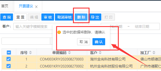 已审核状态的开票建议不支持删除。删除后可以根据勾选对应的对账单重新生成开票建议。
