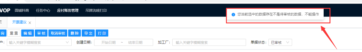 待审核的开票建议支持审核,审核时系统会校验开票建议中是否存在未录入的发票号码,如果存在审核失败,需要将开票建议中的发票号码录入完全。