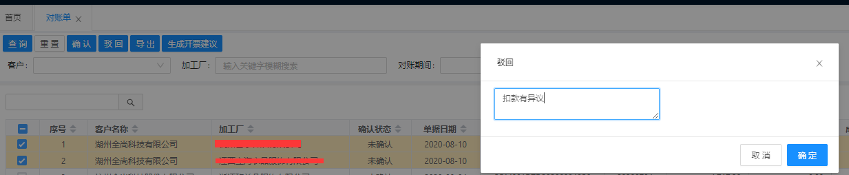 未确认状态的对账单支持驳回,已确认的对账单不支持驳回操作。