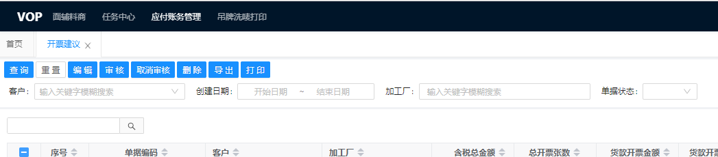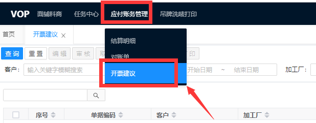 系统支持按照客户、创建日期、单据状态进行开票建议的查询。